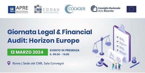 APRE in collaborazione con CODAU e CODIGER è lieta di invitarvi alla Giornata Legale & Financial – Audit: Horizon Europe” che si svolgerà in presenza, il prossimo 12 marzo 2024 dalle 09:30 – 16:00.